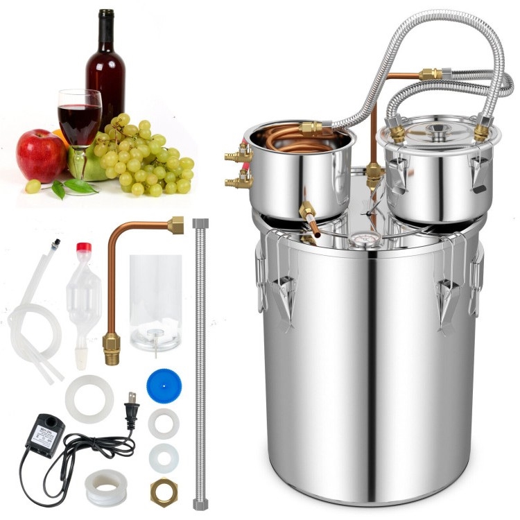 This 10 gL Stainless Steel distiller kit has a boiler pot, a thumper keg and a condenser, which is convenient for fermenting and distilling. Simply connect the bubble airlock and stopper and add water to half-fill the bubbling airlock. Has built-in thermometer on boiler pot, displays Fahrenheit and Celsius. The alcohol turns to vapor at about 173°F, while the water content in the fermented product turns to steam at 212°F. This 10 gal fermenter pot can also heat fermented results. It supports a variety of heating methods, including gas stove, induction cookers, electric ceramic stoves, coal stoves and firewood. Distill water, oil, or alcohol with ease. Please discard the first 4-7 oz of liquid as it comes out of the condenser distillate outlet. The thumper keg enables you to add more flavor to the distilled results. Apart from that, our condensing pot is designed with copper coil for fast cooling and an open top design to accelerate cooling. Please ensure a continuous source of cold water to the condenser pot. Made of food-grade stainless steel material, this multi-purpose distiller set is durable and safe.